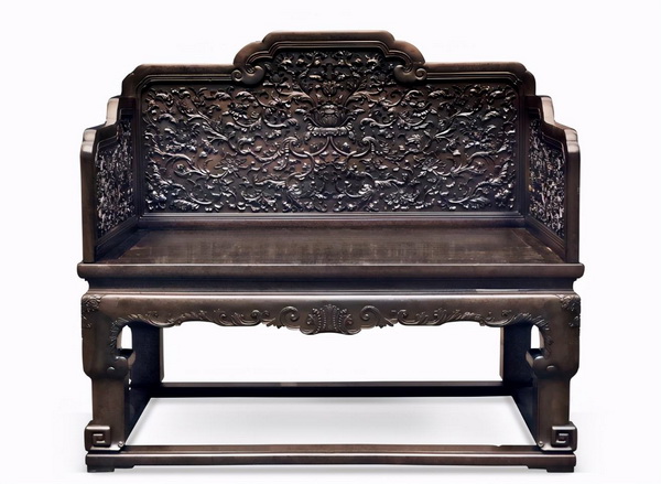 此例寶座通體紫檀大料制成,四面有工,金星滿布,如云似錦。鏟地浮雕西番蓮,靈動(dòng)自然,設(shè)計(jì)圖案明顯出自如郎世寧等宮廷藝術(shù)家之手,和圓明園內(nèi)的西洋建筑風(fēng)格相同,是乾隆皇帝熱衷于西洋藝術(shù)的又一佐證。