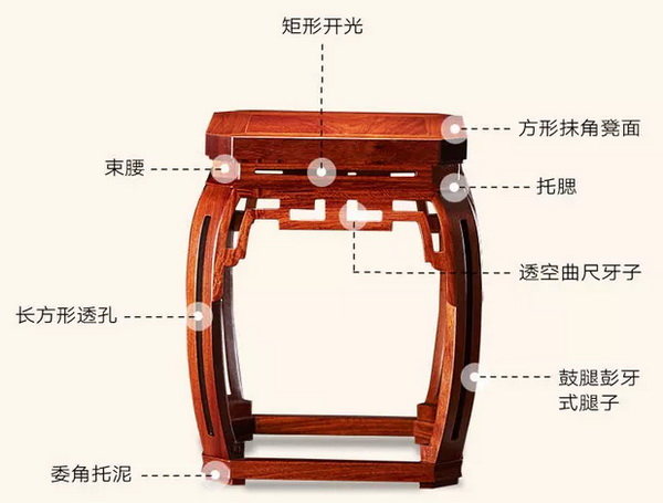 傳統家具,凡結體作方形的或長方形的,一般可以用“無束腰”或“有束腰”作為主要區分。在無束腰杌凳中,圓材直足直棖的是它的基本形式,有束腰杌凳則大多采用“鼓腿彭牙”的造法。