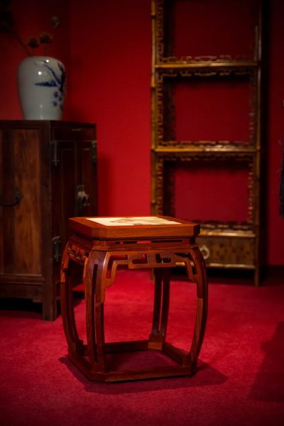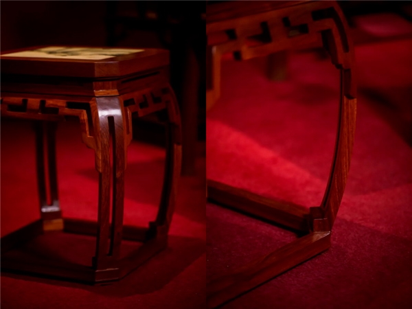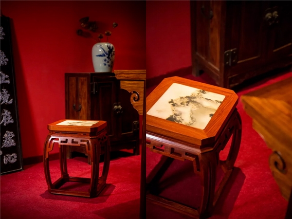 此次紅橋紅仿古家具團隊以此件作品造型為參考,選用,緬甸花梨搭配云石面板,拙樸而富有雅致的意趣,給人以簡潔明快、耳目一新之感。