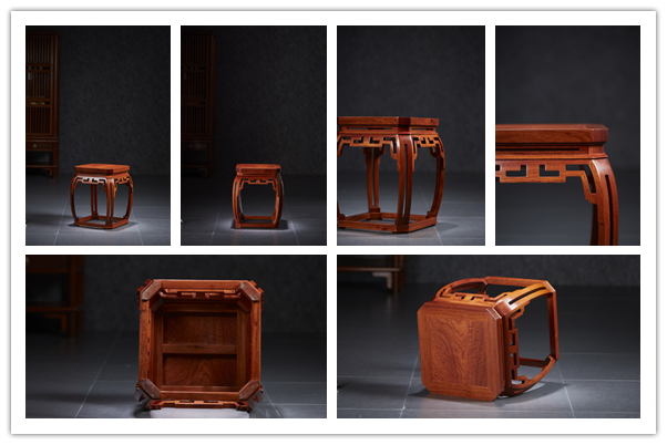 此方凳面下有束腰,束腰上有細長的矩形開光,束腰下裝有托腮,透空曲尺牙子,四條腿子做成鼓腿彭牙式,每條腿子上均開有長方形透孔,足端下承長方委角托泥。