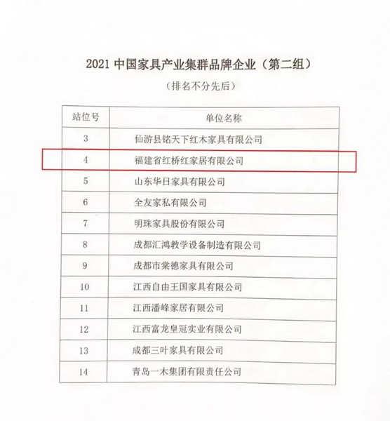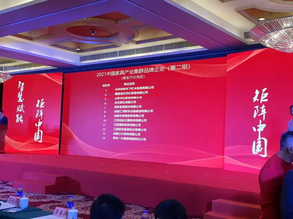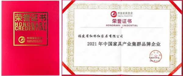 本次會議向優(yōu)秀產業(yè)集群、單位和個人授予榮譽稱號與證書。福建省紅橋紅家居有限公司(以下簡稱紅橋紅)被授予“2021年中國家具產業(yè)集群品牌企業(yè)”榮譽稱號。