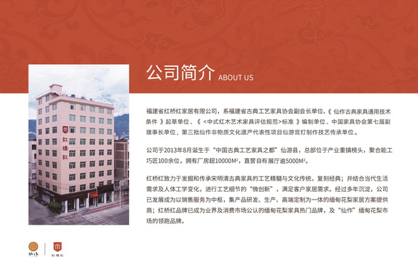 福建省紅橋紅家居有限公司,系福建省古典工藝家具協會副會長單位、福建省工藝品協會常務副會長、中國木材與木制品流通協會副會長單位、中國家具協會會員單位,《 仙作古典家具通用技術條件》起草單位、《 <中式紅木藝術家具評估規(guī)范>標準 》編制單位、第三批仙作非物質文化遺產代表項目仙游宮燈制作技藝傳承單位。